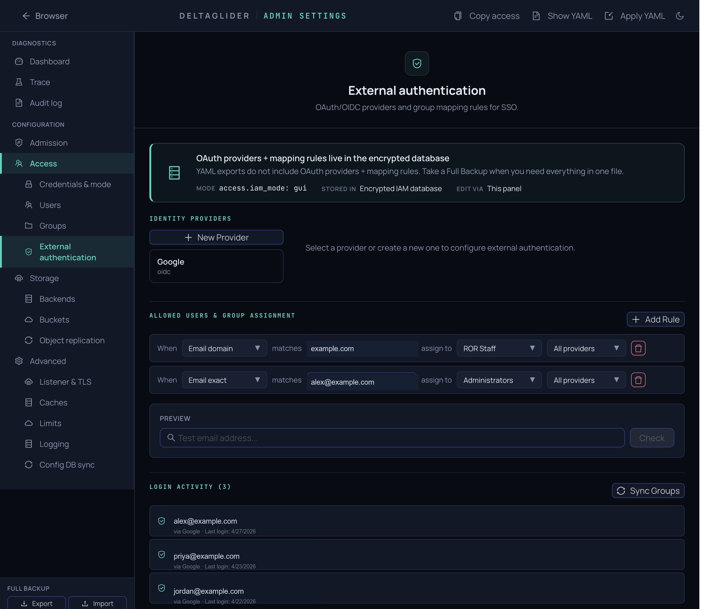 In declarative mode, access.iam_users, access.iam_groups, access.auth_providers, and access.group_mapping_rules in the YAML ARE authoritative. The reconciler runs on every /config/apply (or section-PUT on access), diffs YAML against the encrypted DB, and applies creates/updates/deletes atomically in a single transaction. User/group IDs are preserved across updates so OAuth external_identities stay valid through access-key rotations. See declarative-iam.md for the wire shape, adversarial edges, and the two setup workflows (export-from-DB vs author-from-scratch).